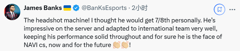 Banks:爆头机器!我个人觉得他本能拿到Top7-8。他在赛场上表现惊艳,很好地融入了国际战队,自始至终保持稳定发挥。毫无疑问,无论现在还是将来,他都是NAVI战队CS的招牌人物。