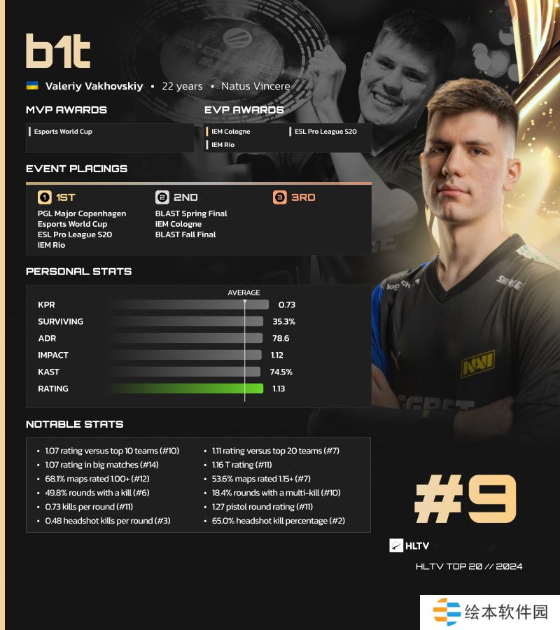 Valeriy Vakhovskiy | b1t在年度Top20选手榜单中追平了个人最佳排名——第9名。此前,他不仅斩获了职业生涯首个MVP奖项,还凭借一系列出色表现给人留下了深刻印象。