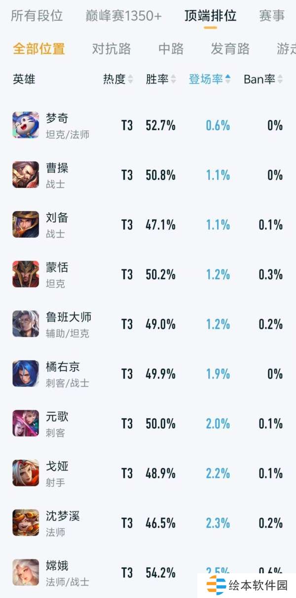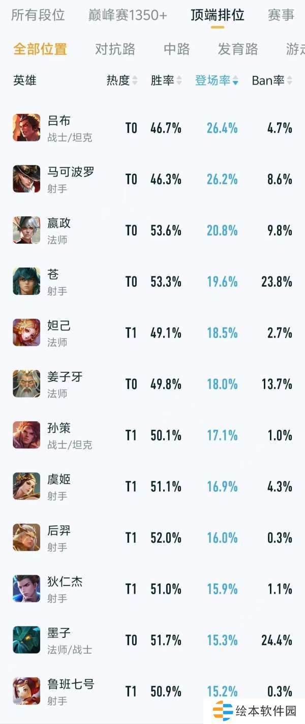吕布、马可波罗、嬴政、苍、妲己位居前五,前十有五名发育路英雄。