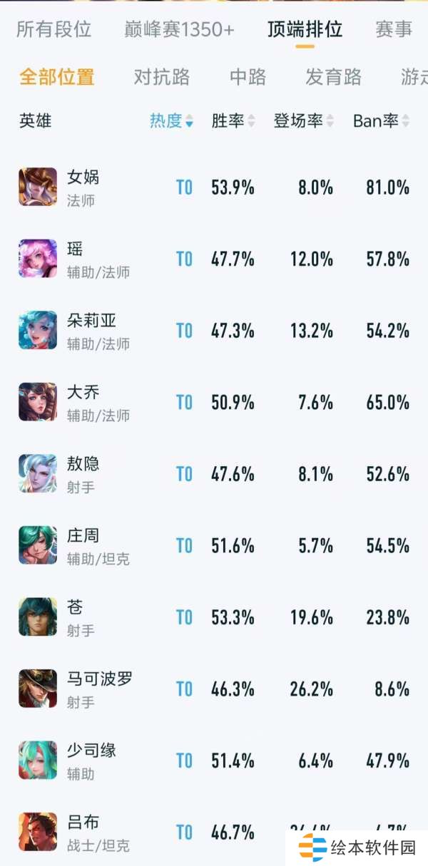 女娲、瑶、、朵莉亚、大乔、敖隐位居前五,游走位前十中占据五个位置;