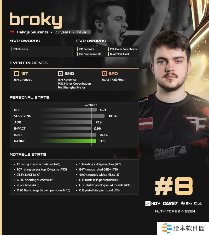 Helvijs Saukants | broky在2024年Top 20选手榜单中位列第8位,这得益于他展现了惊人的巅峰状态,并赢得了一系列令人印象深刻的个人荣誉。
