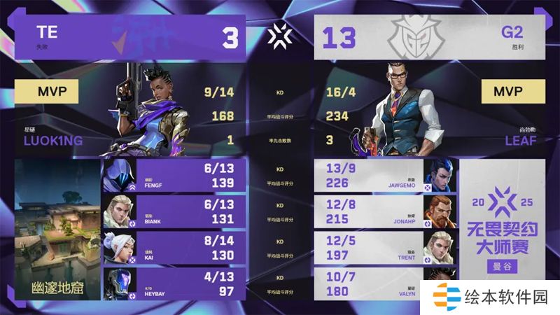 第二张地图幽邃地窟,G2 13:3 TE,MVP给到了Leaf选手。