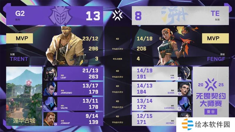 第一张地图莲华古城,G2 13:8 TE,MVP给到了trent选手。