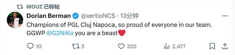 Dorian Berman | xertioN:克卢日冠军,为队伍的大家深感骄傲。GGWP G2 NiKo,你就是一头野兽。