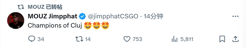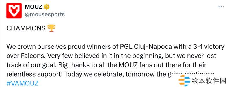我们以3比1战胜了Falcons,自豪地成为了PGL 克卢日-纳波卡赛事的冠军。起初很少有人相信我们能做到,但我们从未偏离自己的目标。非常感谢所有MOUZ战队的粉丝们给予的不懈支持!今天我们尽情庆祝,明天则继续努力拼搏。