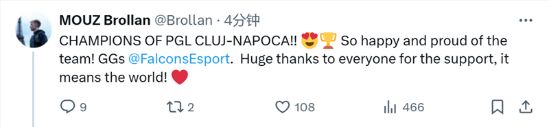 Ludvig Brolin | Brollan:PGL 克卢日-纳波卡站的冠军!!为队伍感到无比开心和自豪!GG Falcons。非常感谢大家给予的支持,这对我们来说意义非凡!