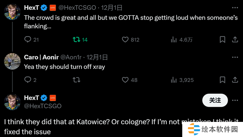 随后在评论区中有CSer建议主办方可以在适当时候关闭X光,而HexT也回复道:“我认为主办方在卡托维兹就这么做的?要么是科隆?如果我没搞错的话,这么做解决了这个问题。”