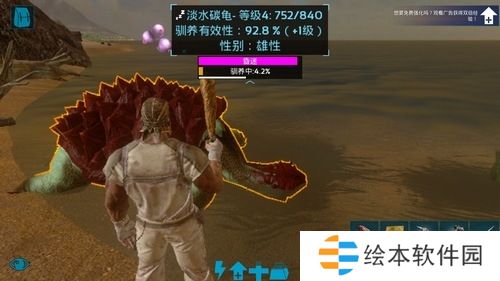 嫌嘟嘟鸟太简单了,那么我们再去驯服个淡水碳龟,做个木制球棒,用它去击打乌龟,乌龟的攻击力对于现在的我们来说还是很有威胁的,还好它的移动速度较慢,所以建议大家打的时候把握好节奏,打一下退几步。实在手残的话就跟它硬干,快没血的时候就跑,找个石头躲着等回好血后再继续干,直到将他敲晕,然后用紫色果子驯养,驯养时间较长,直到天黑才驯养成功。