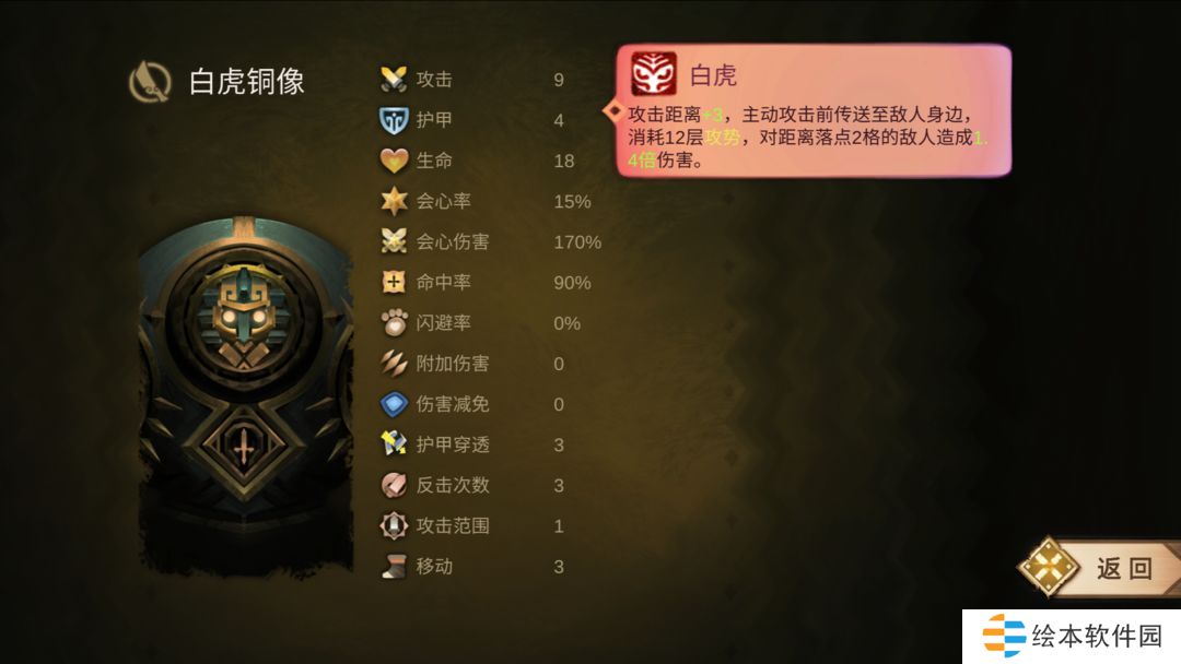 白虎铜像由武士+甲卫组合而成,继承了青铜武士使用攻势的特点,并且增加了高达3点的攻击距离,可以更安全的消灭敌人。