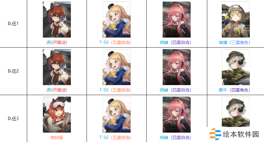 队伍1:虎I(开服送)、T-50(五星自选)、胡蜂(四星自选)、狼獾(三星角色)