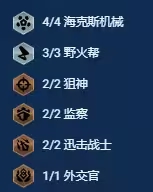 4海克斯、3野火帮、2狙神、2监察、2迅击战士、1外交官