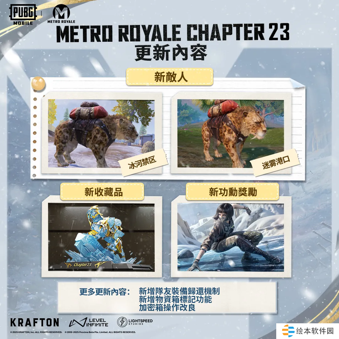 枪械和载具更新:M79烟雾榴弹发射器震撼登场,让你在战场上快速制造烟雾,掌控战局。同时,新增强壮的猛犸象和迅捷的剑齿虎两种全新主题载具,助你驰骋沙场,勇夺胜利!
