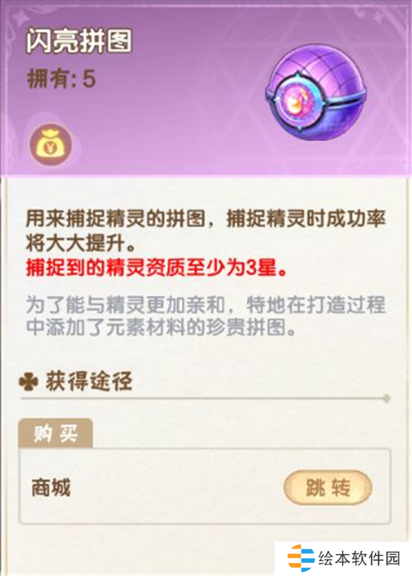 如果希望获得一只高资质精灵,最简单的方式就是使用高品质拼图进行捕捉,例如“闪亮拼图”捕捉到的精灵资质至少为3星,基础属性值比较高,
