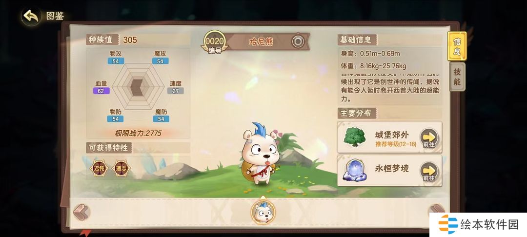 别看它小小只的就低估了人家,哈尼熊的特性遗志,可以在倒下后,将自身的属性强化全部附加给下一位上场的精灵,极强的辅助属性让哈尼熊成为挑战BOSS时的不二选择。