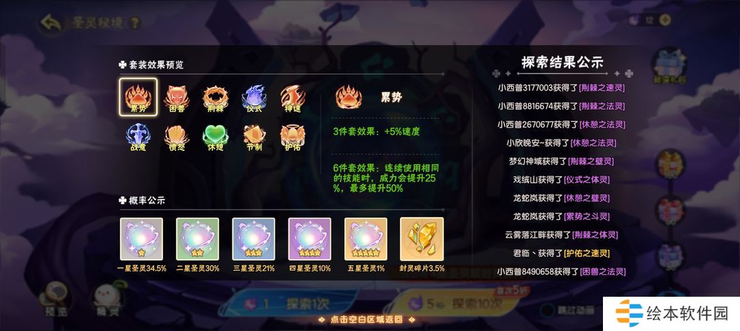 ③圣灵,即套装装备,五星概率低,抽出自己想要的套装也不容易,只能说随缘就好,氪佬随意,贫民三星四星将就用着先,优先凑齐套装效果,4星圣灵升级到5星需要15个封灵碎片(分解三个五星)。