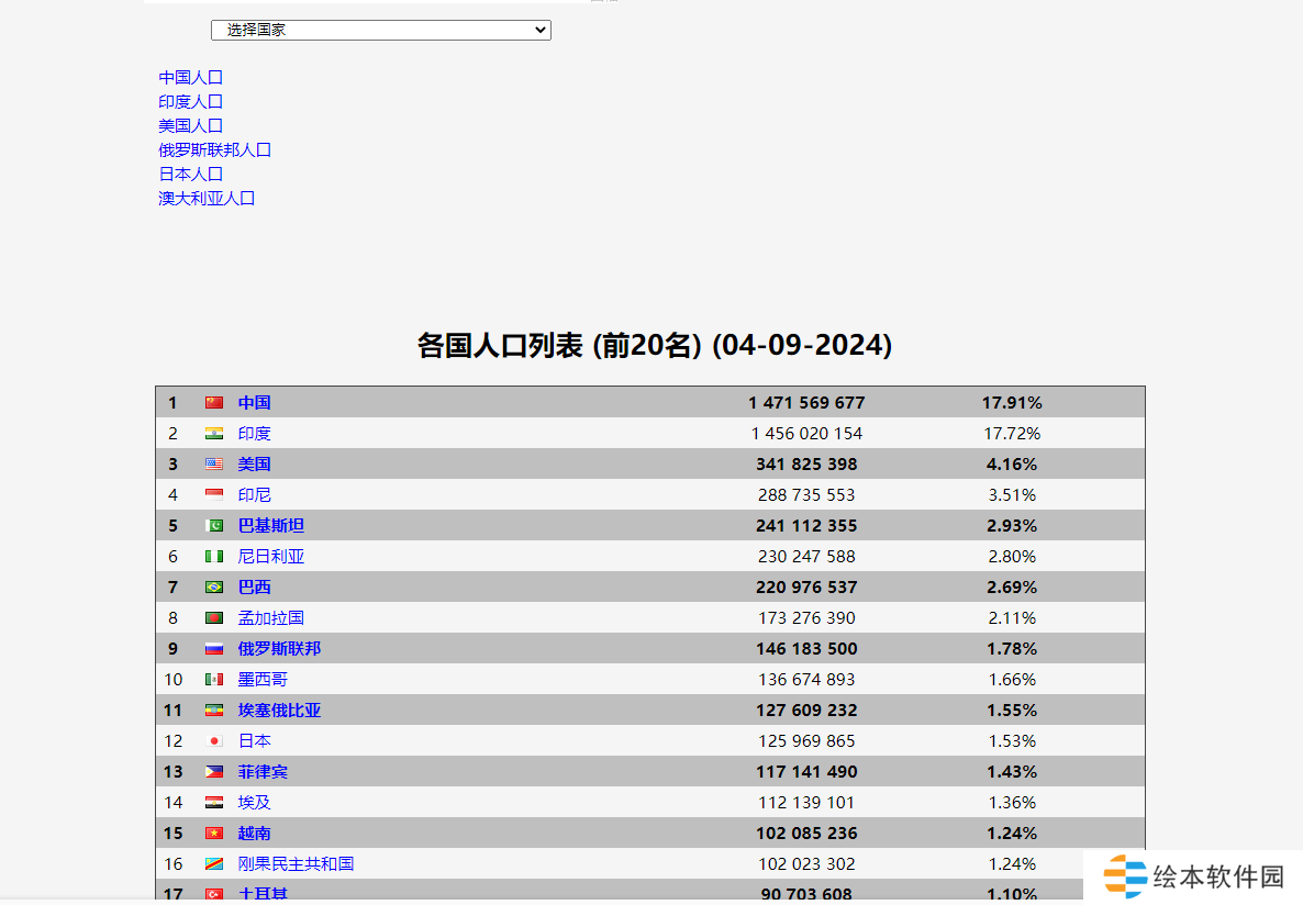 该网站还列出了目前各国人口数排名,也可以选择国家查看该国的数据统计,此外由于人口统计具有一定的滞后性,该页面统计的国家人口会与当下有差距。