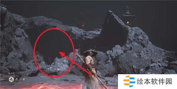 沿着山路一直往前走到斜坡快到底部的位置,可以看到前方两个是灯笼,从石灯笼处往下跳,可以看到岩壁上有个山洞。这里也可以直接走到底然后走进山洞,因为附近环境比较像,所以用石灯笼来做标志物方便大家区分。