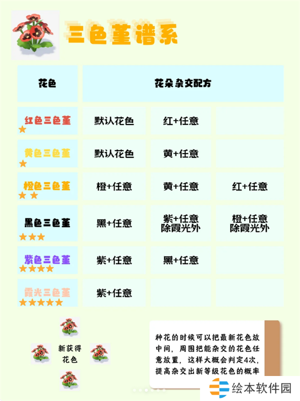 3、最新获得的花的种类可以放在十字的中心,增加判定次数,提高高星杂交概率。
