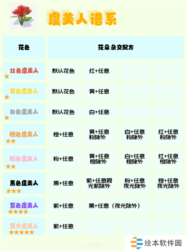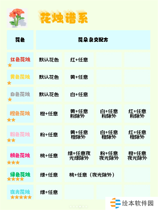 下面是各花卉谱系的杂交配方,直接参考即可。