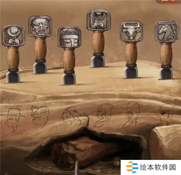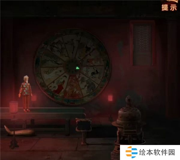 5、点击门再次来到转轮场景,对右上角的门使用梯子后门自动开了,进入沙漠场景看到彤彤和卿卿,不过无法对话,点击左边的佛像,线索就是转轮殿中那几个人的变化了,调整一下如下图佛像裂开了拿到断臂和一个小圆球。