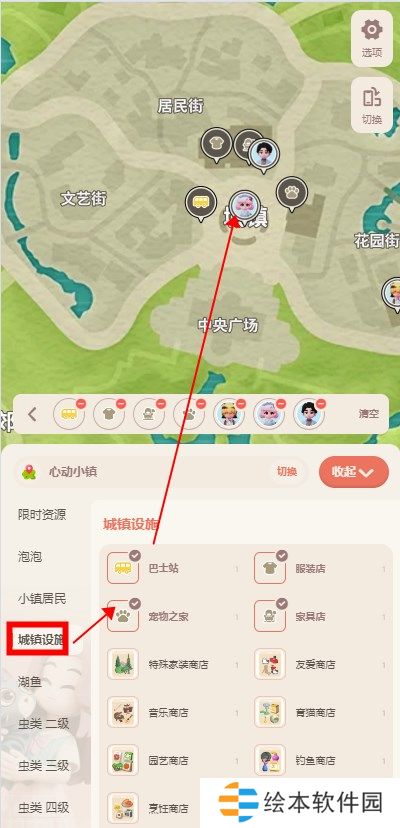 2、选择城镇设施,然后会有巴士站、服装店、家具店这些地图信息,勾选以后就会相对应的在地图上显示出位置来。