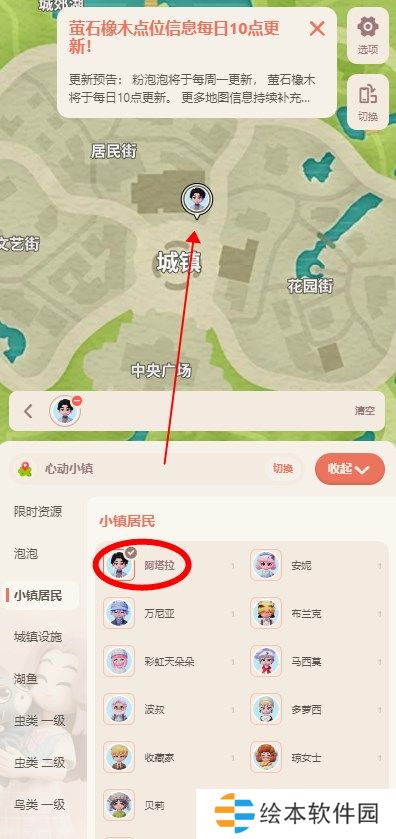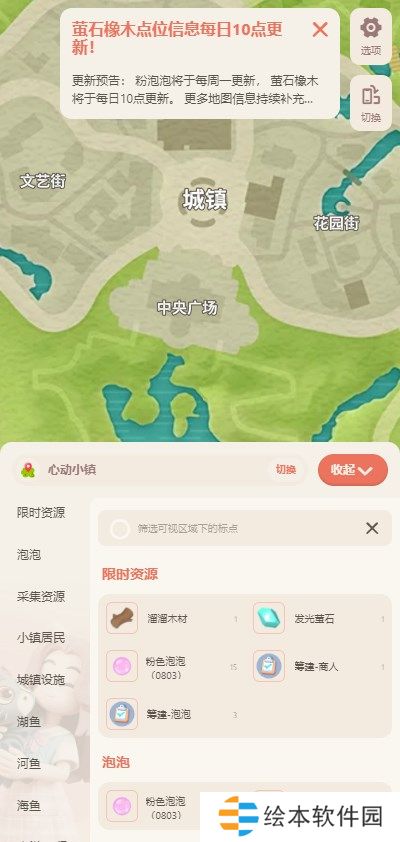 心动小镇地图使用教程:1、地图工具进入之后可以查看每日萤石橡木点位信息,每日十点就会更新,下面还有鸟类,小镇居民,城镇设施等点位地图可以使用。