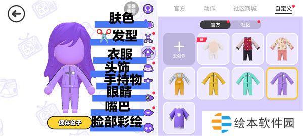 〖编辑形象〗→购买官方衣服,动作和玩家自制衣服,以及自定义更换衣服