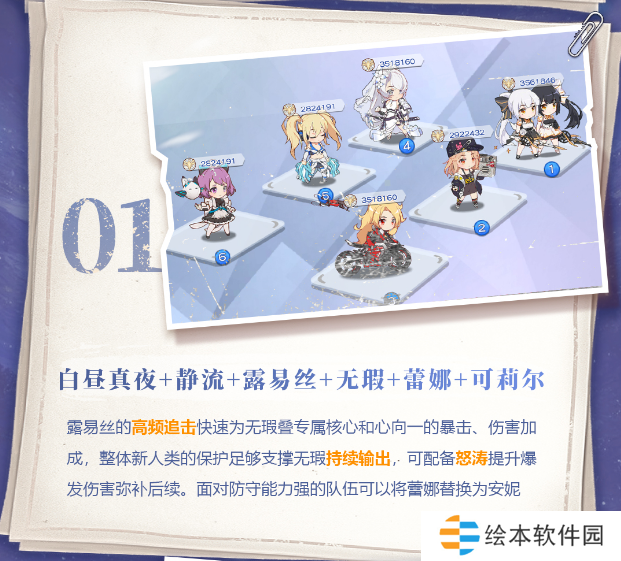 露易丝的高频追击快速为无瑕叠专属核心和心向- -的暴击、伤害加成,整体新人类的保护足够支撑无瑕持续输出,可配备怒涛提升爆发伤害弥补后续。面对防守能力强的队伍可以将蕾娜替换为安妮。