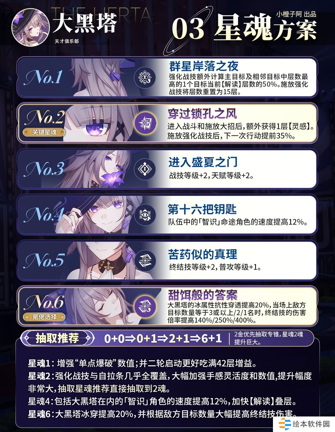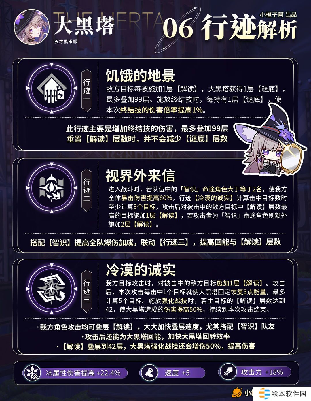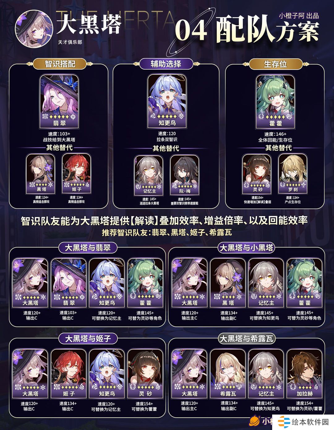 ②智识队友选择:智识队友需要具备高频出手与对群输出能力,能为大黑塔提供【解读】叠加效率、【解读】增益倍率,以及大黑塔回能效率等重要增益。