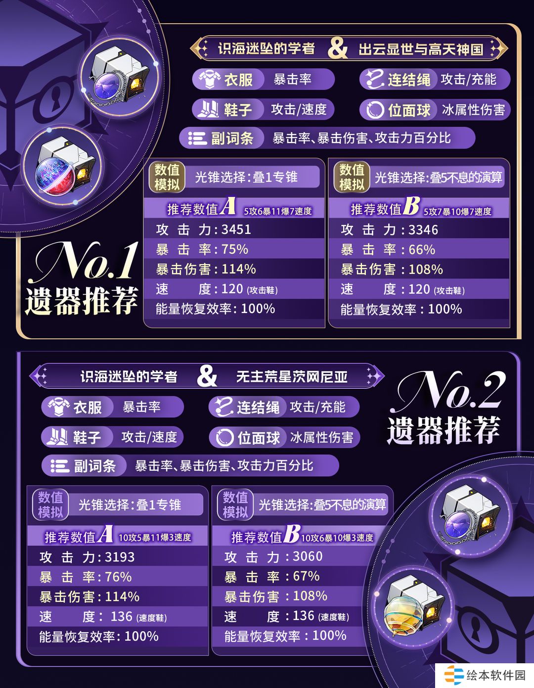② 内圈遗器首推【出云显世与高天神国】,大黑塔需要搭配一个智识,恰好可触发遗器效果,加攻与刚需的暴击加成;其次推荐【无主荒星茨冈尼亚】,增加双暴加成。