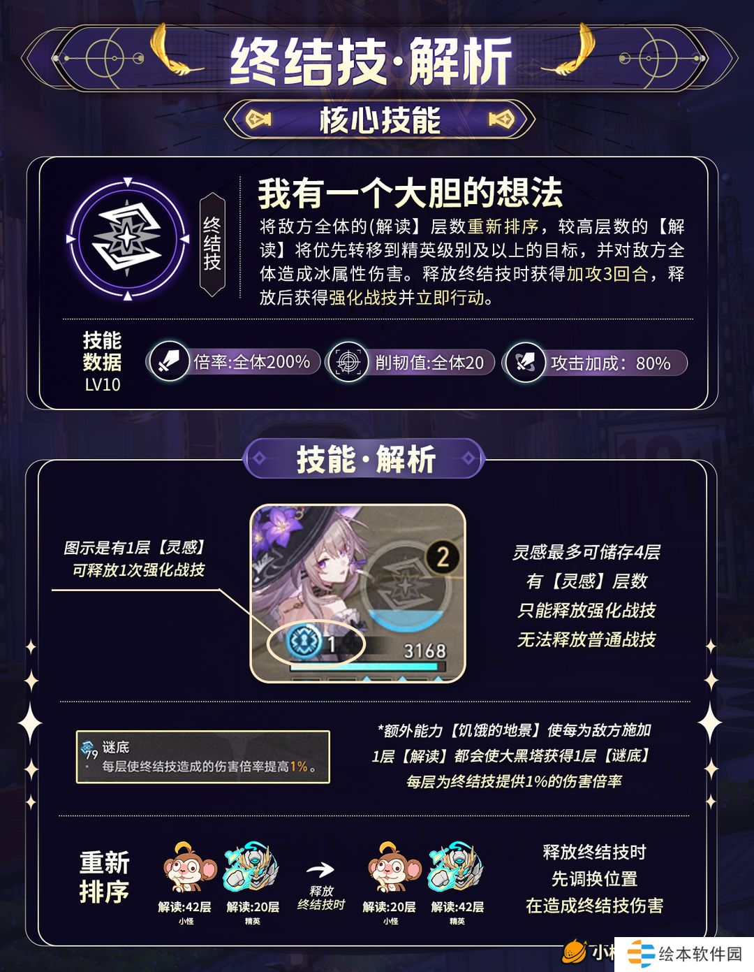 ① 终结技先是将【解读】层数重新排序,优先将高层数的【解读】转移至精英BOSS目标,然后再打出群体冰伤。