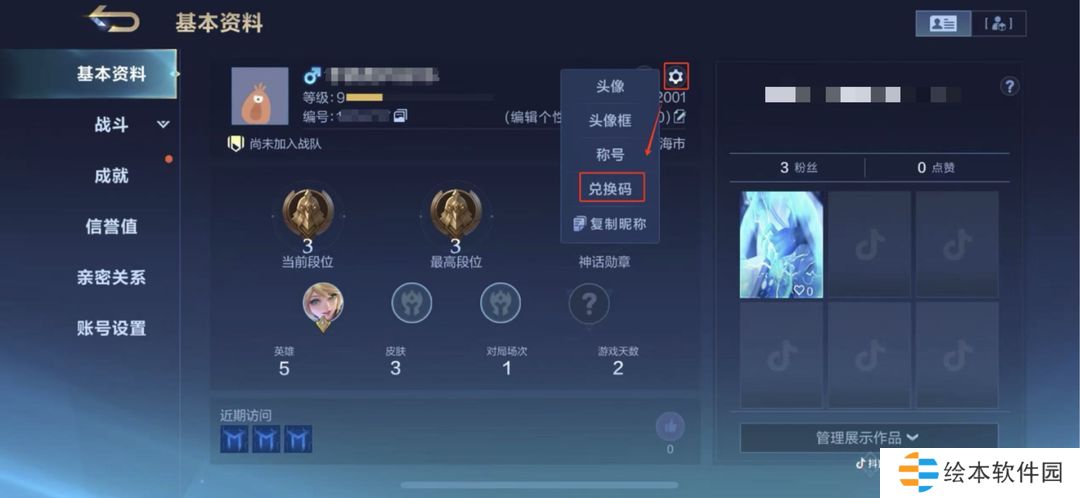 2、在个人主页中,点击服务器编号上方的小齿轮,选择兑换码;