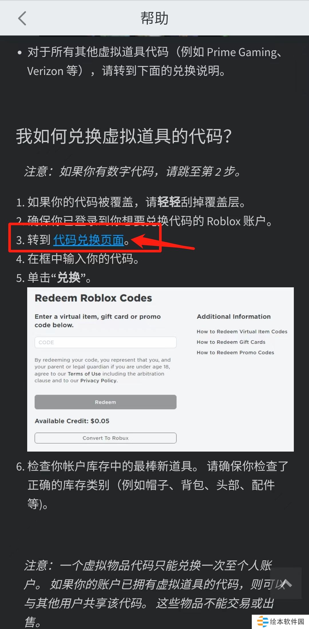 4、进入该问题之后,往下滑,找到如图所示的蓝色字体【代码兑换页面】,点击进入。