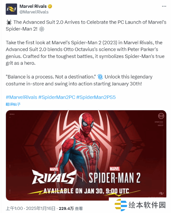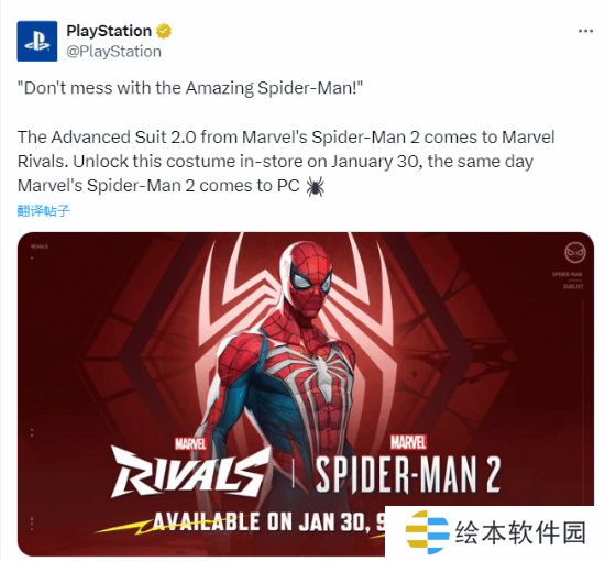 PS和《漫威争锋》官方推特共同宣布了这一消息,预计这款全新外观将于1月30日加入《漫威争锋》,值得一提的是,当天也是《漫威蜘蛛侠2》登陆PC平台的日子。
