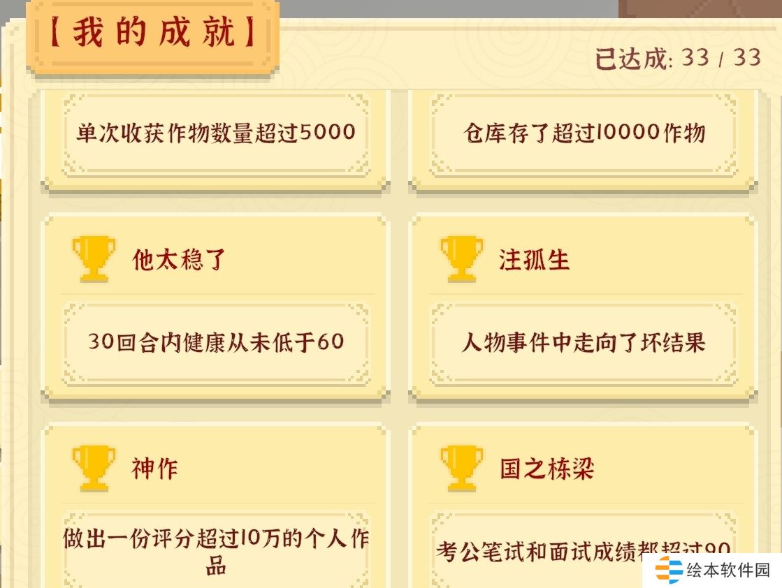 10、[隆平大弟子]和[屯屯鼠转世]可以一起做,反正一般开局走种田线比较赚钱,记住要有三块田后解锁大农田,租了大农田且升级了家乡旧宅和大农田仓库后才有足够的空间屯作物。而单位产出主要取决于工具和机械以及农才,工具在集市临时商人出买,机械在大农田处升级。