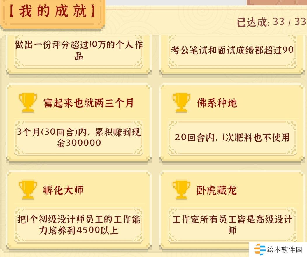 12、[孵化大师]和[卧虎藏龙]和[神作]可以一起做:前期主要提升美术然后创作大型个人项目,再不断改图就可以完成[神作],[孵化大师]和[卧虎藏龙]在创作线租写字楼之后按字面意思操作即可,先雇佣初级,知名度增加就雇佣中级,然后雇佣高级,留一个初级培训到完成任务就解雇,然后把高级招进来,记得要在集市家居商城买好提高员工能力的装饰,否则会累死。但开公司不建议用来赚钱,赚不了多少,还要花时间和精力,仅仅是为了达成成就才开公司。