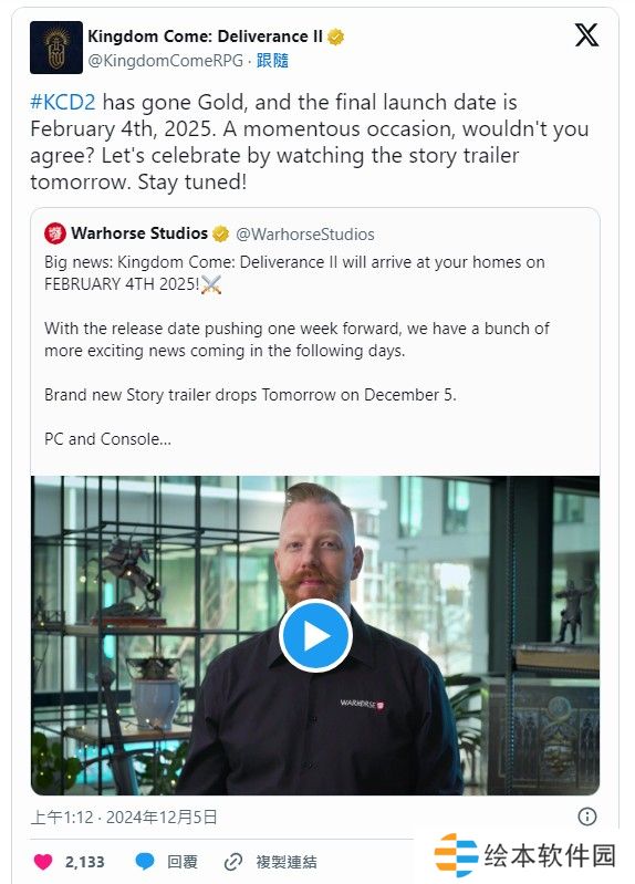 游戏开发商 Warhorse Studios 宣布《天国拯救》系列续作《天国拯救 2 / 天国:拯救 2(Kingdom Come: Deliverance 2)》将提前一周、于 2025 年 2 月 5 日问世。