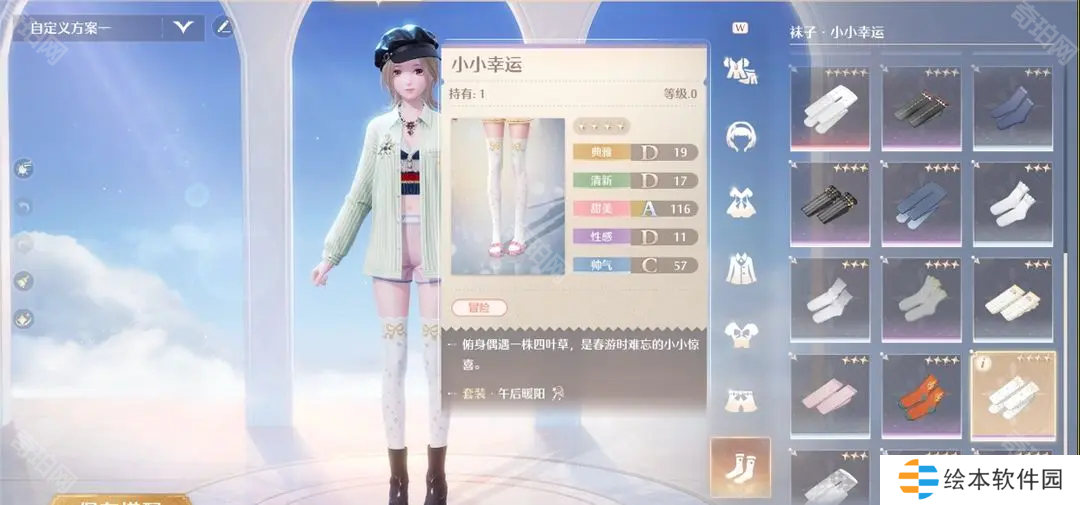 白天的(5点-21点)西西亚艺术学院采风基地的二楼,密正因没有一双能够一直带着幸运的袜子而苦恼,换一件装扮或许可以给她一些灵感。