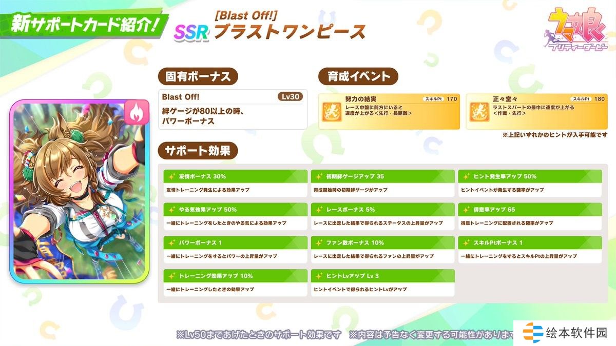 新支援卡池PU角色则为 SSR 防爆装束 [Blast Off!]ブラストワンピース 以及 SR 泡泡糖 [先阵スプラッシュ!]バブルガムフェロー 。