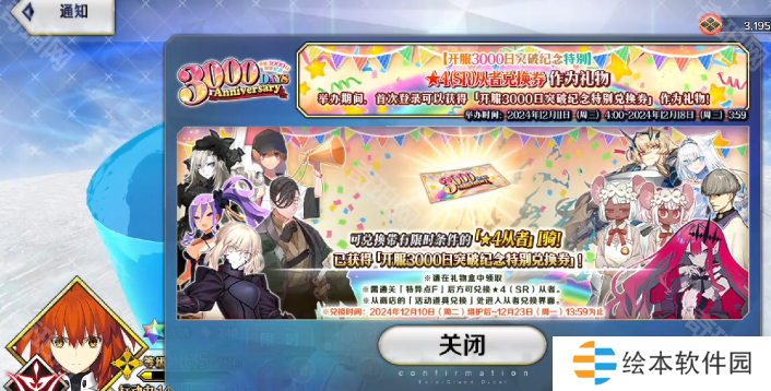 3、使用开服3000日突破纪念特别兑换券在对象从者中选择喜欢的1骑