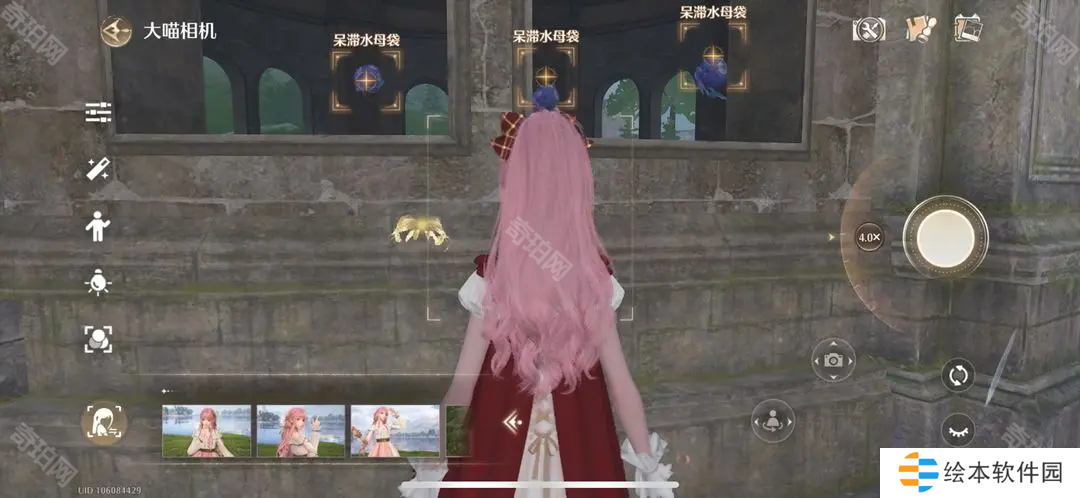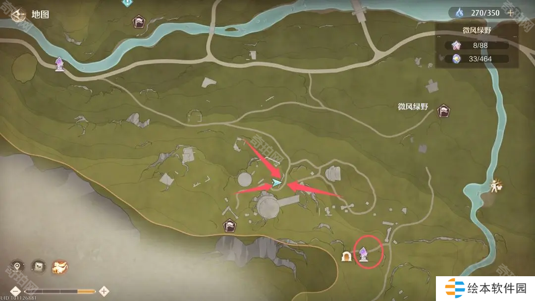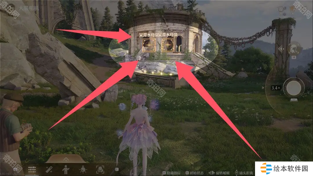 研究员斯菲丹特正在微风绿野中心的遗迹群等待,帮他拍摄一张有三只果滞水母袋同框的照片吧!