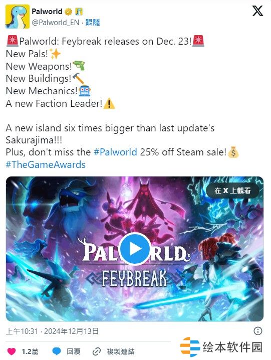 游戏开发团队 Pocketpair 于12月13日在 2024 年度游戏奖项「The Game Awards(TGA)」颁奖典礼正式揭开《幻兽帕鲁(Palworld)》大型更新「天坠之地(Feybreak)」预告影片,该内容预定于 12 月 23 日上线。