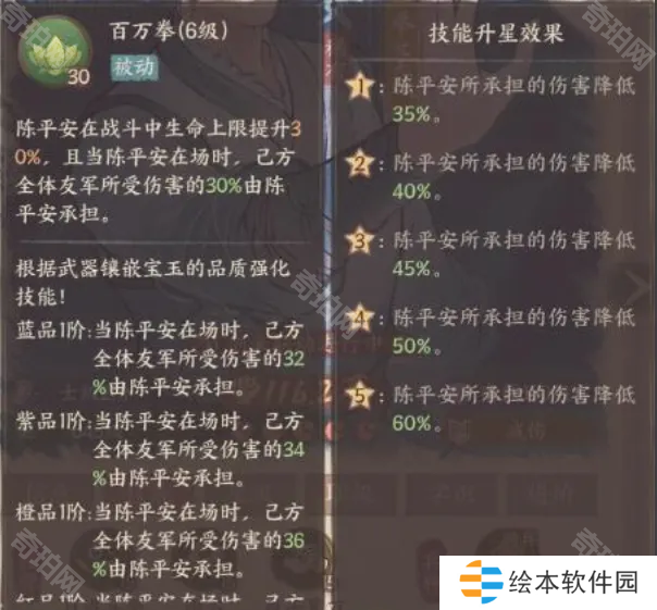 被动技能“百万拳”,与樊梨花承担全体伤害的技能相似,但是陈平安的机制更全面。不仅可以承担友军受到的所有伤害,该技能升星后还能降低其承担伤害的数值。即能帮助友军分担大量伤害又能保证自己不会抗太多伤先暴毙,极大程度缓解了坦克保c能力弱的痛点。