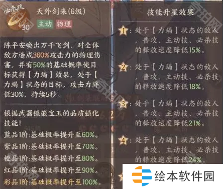 必杀技“天外剑来”,该技能造成伤害的同时附带全新debuff(负面效果)【力竭】。此效果可以降低敌方的攻击力,普攻速度以及技能释放速度,还可以作用到敌方全体僚属。不仅可以减缓敌方的进攻,还不用担心debuff套不到想套的僚属,可以克制大部分阵容。