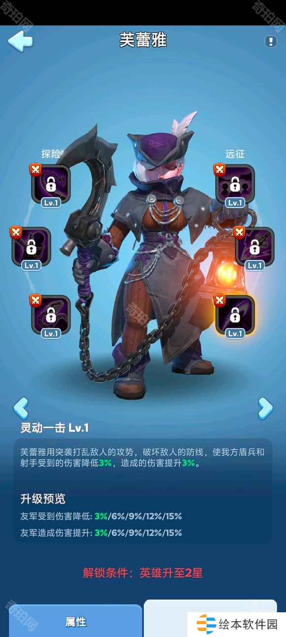 芙蕾雅用突袭打乱敌人的攻势,破坏敌人的防线,使我方盾兵和射手受到的伤害降低3%,造成的伤害提升3%。