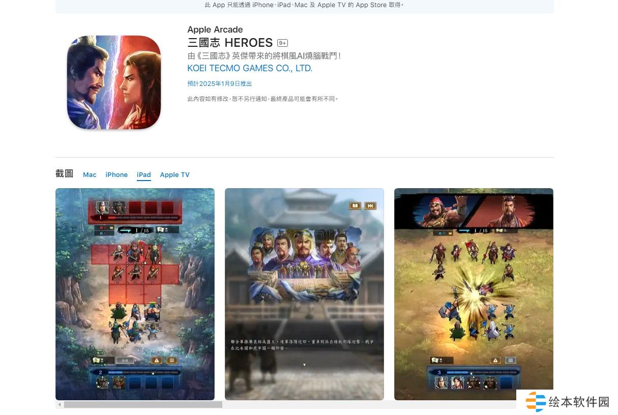 光荣特库摩游戏宣布,回合制战棋游戏《三国志 HEROES》将于 2025 年 1 月 9 日(四)在 Apple 公司 于 App Store 提供的订阅服务「Apple Arcade」推出。