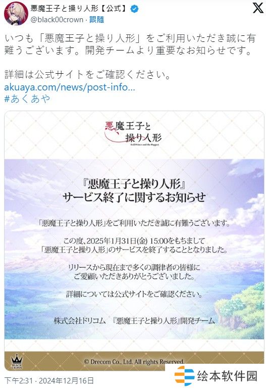 Drecom 12月16日宣布,治癒吊花者与诅咒的黑暗奇幻冒险游戏《恶魔王子与提线人偶(悪魔王子と操り人形)》(iOS / Android)将于日本时间 2025 年 1 月 31 日 15:00 终止服务。