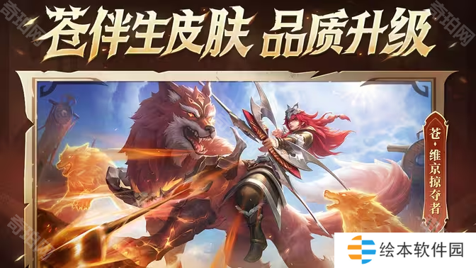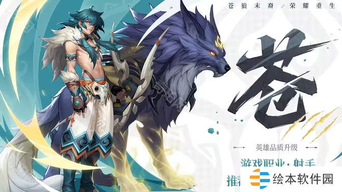 苍驭狼挽弓射箭,驰骋战场;日光映照在他火红的发上,橙金狼魂环绕周身。