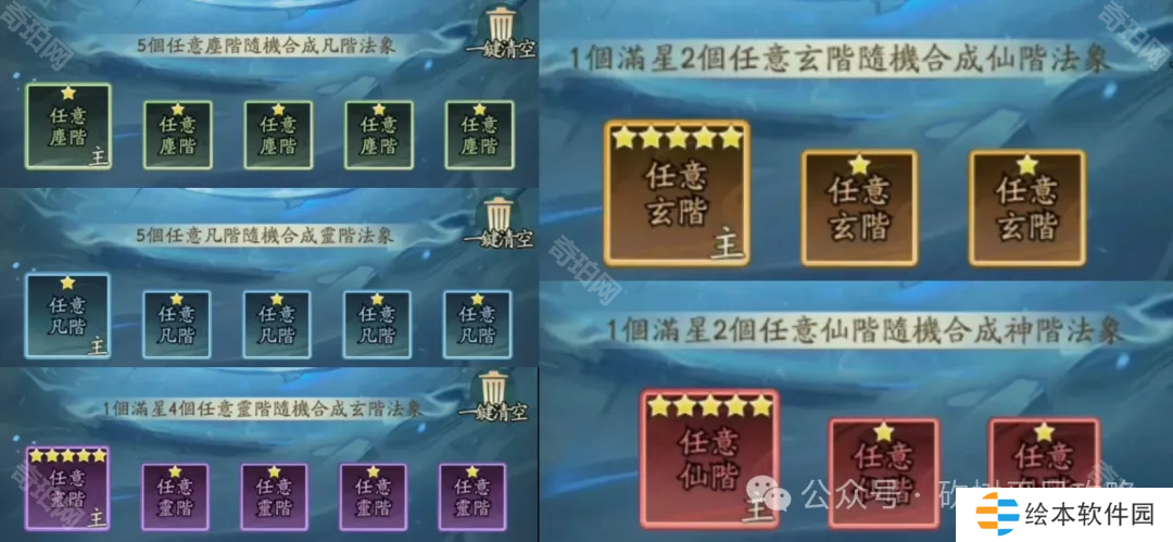 合成:这里凡阶灵阶都比较简单,反而抽不到的玄阶-仙阶都比较难合成,5个1星合成下一阶。