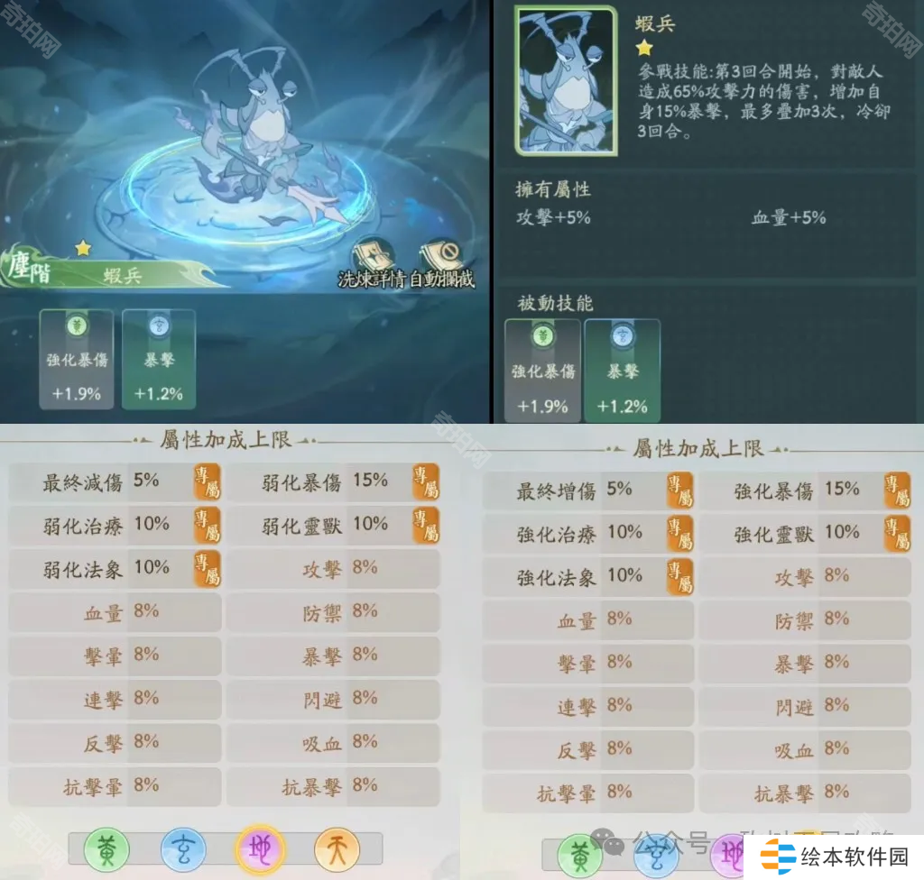 分为天地玄黄四个等级,地级有减伤,天级有增伤。玄黄则是四维属性。